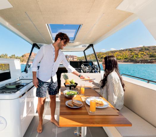 The multifunctional aft sunbed is designed for lounging and in addition, it offers spacious storage underneath for gear and watersports equipment.