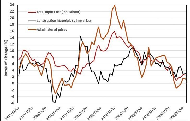 The political or policy environment clearly acts as a brake on both economic growth and the appetite for fixed investment. Graph 4 shows the correlation between construction fixed investment data and political confidence. The overwhelming majority (+50%) of respondents to the BER manufacturing confidence surveys rated the latter as highly ‘obstructive’. The Government of National Unity partners’ recent non-alignment on fiscal policy clearly shows in the increased uncertainty, over the last quarter (Q1, 2025). Confidence has a direct impact on construction fixed investment and that in turn on construction materials sales. Graph 5 shows the extent to which administered prices, caused by public sector inefficiencies, are impacting on/ aggravating sector input costs (components petroleum products (22,6%), electricity and water (15,6%) transport and