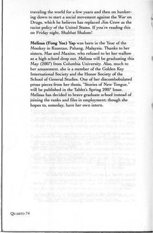 traveling the world for a few years and then on hunkering down to start a social movement against the War on Drugs, which he believes has replaced Jim Crow as the racist policy of the United States. If you re reading this on Friday night, Shabbat Shalom! Melissa (Fong Yee) Yap was born in the Year of the Monkey in Kuantan, Pahang, Malaysia. Thanks to her sisters, Mae and Maxine, who refused to let her wallow as a high school drop out, Melissa will be graduating this May (2007) from Columbia University. Also, much to her amazement, she is a member of the Golden Key International Society and the Honor Society of the School of General Studies. One of her discombobulated prose pieces from her thesis, "Stories of New Tongue," will be published in the Tablet's Spring 2007 Issue. Melissa has decided to brave graduate school instead of joining the ranks and files in employment; though she hopes to, someday, have her own intern.