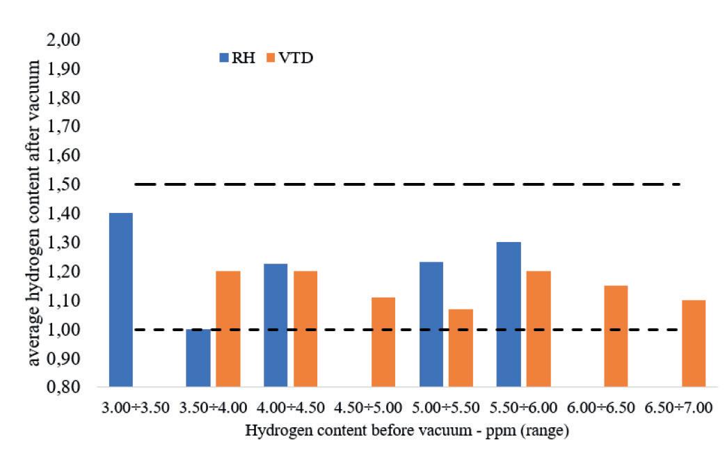 Low hydrogen content is achievable with RH and VTD as well. The chart makes clear that inlet hydrogen content is lower before the RH process compared with inlet hydrogen content for evaluated VTD grades. The main reason for lower hydrogen content in evaluated RH treated heats is that the associated steelmaking process is based on hot metal and an average 20% scrap charge (BOF process). At the same time, the evaluated results from the VTD process are based on EAF melting profiles for charges of at least 70% scrap or more.