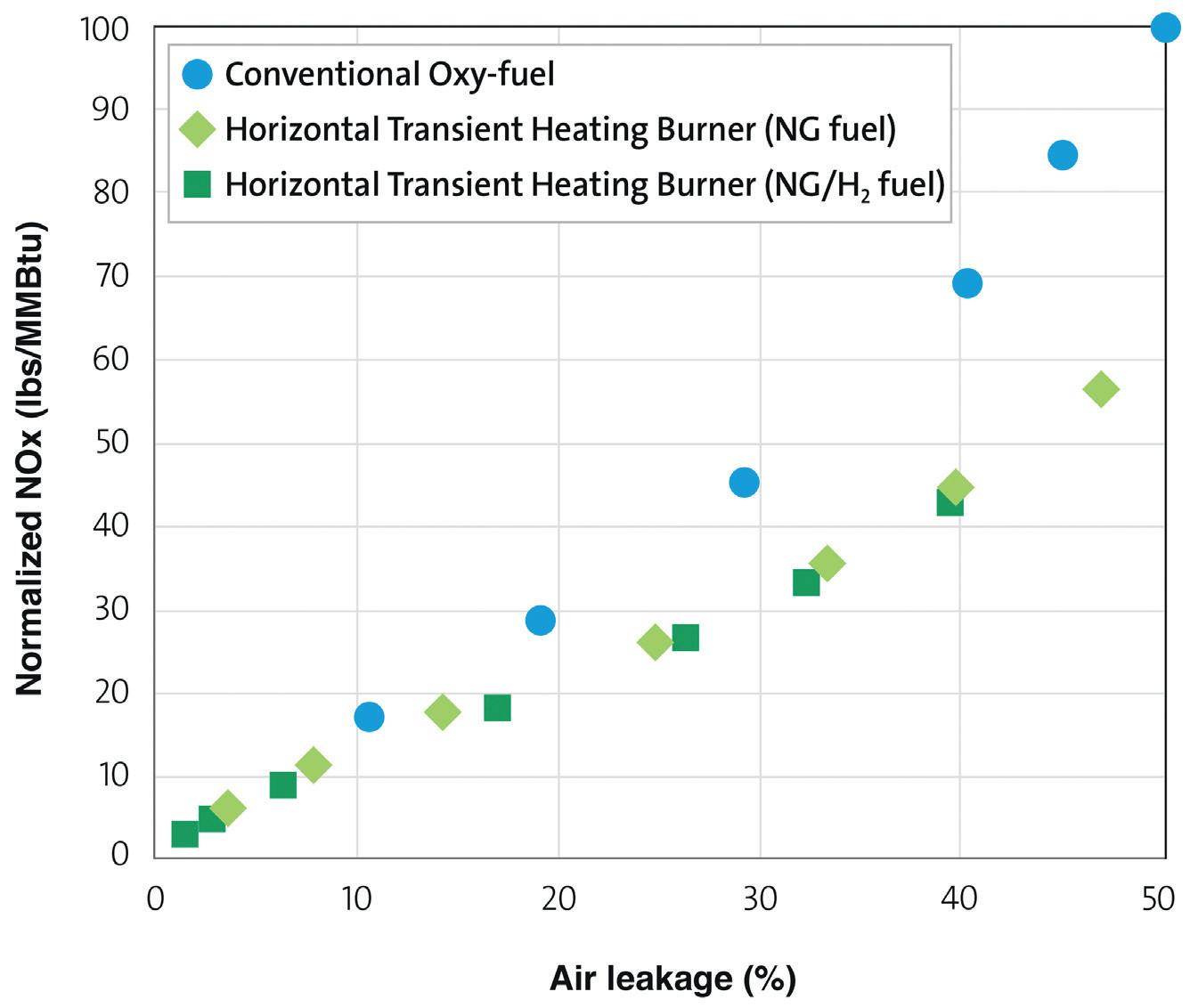 (lbs/million Btu) between a conventional oxy-fuel burner and the HTHB technology, as a function of percent air leakage into the furnace. The HTHB results are presented for two cases with two different types of fuels: one with natural gas and another using a 70% natural gas/30% hydrogen mixture (by heating value).
