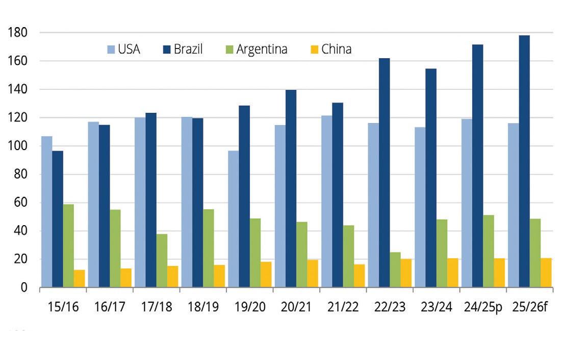 The US soyabean harvest was completed by the end of 2025, totalling around 116M tonnes, a year-on-year decline of around 3.1M tonnes.