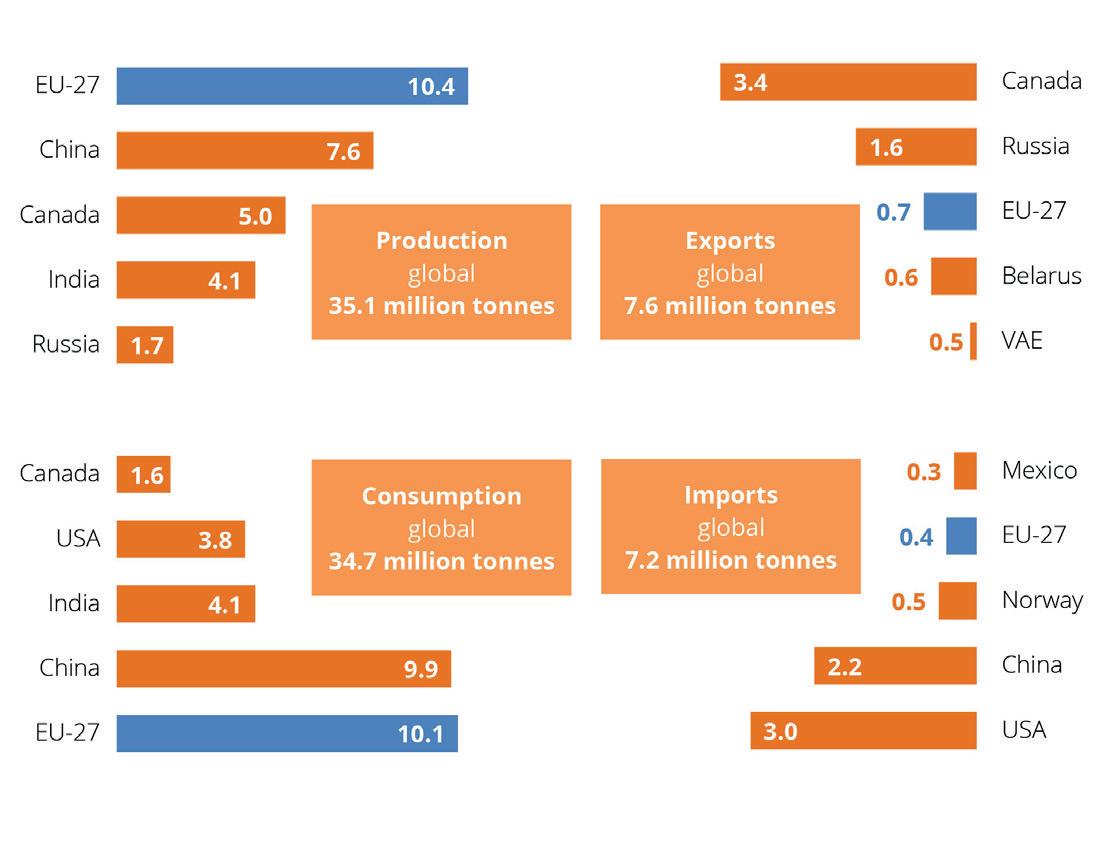 The EU was the largest consumer at just under 10.1M tonnes, followed by China at 9.9M tonnes and India at 4.1M tonnes.