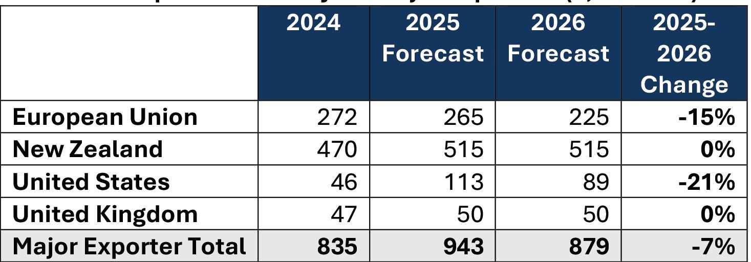 New Zealand’s butter production was forecast at 535,000 tonnes in 2026 and its country’s exports were forecast unchanged at 515,000 tonnes due to stable supplies.