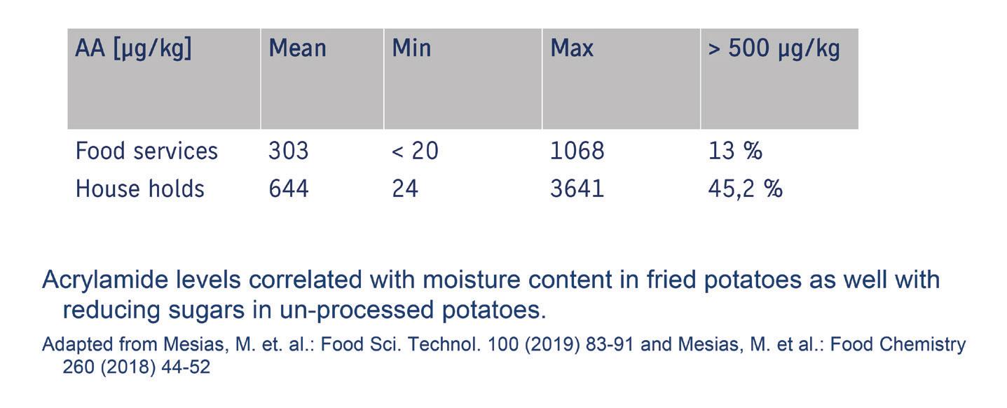 Acrylamide is mostly found in French fries and other fried potato products, with recent studies shedding light on the role of free fatty acids, raw potato selection and internal body production in acrylamide formation and their implications for risk assessment