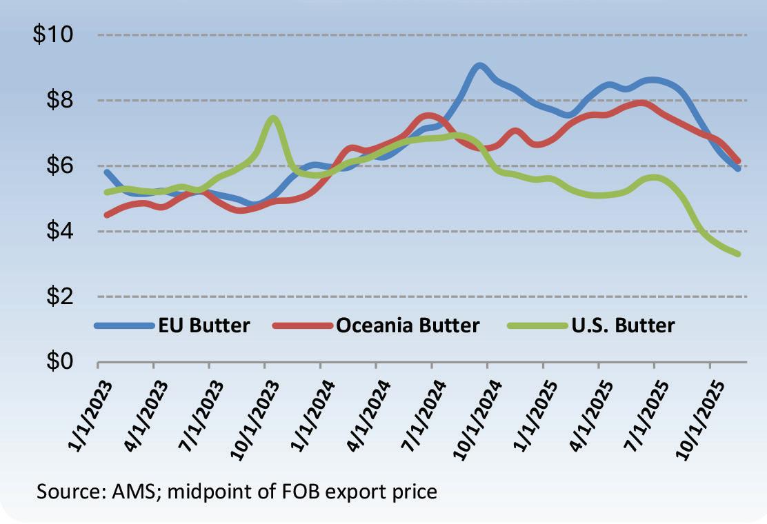 Butter exports from EU and the USA are expected to drop by 15% and 21% respectively in 2025/26 compared to the previous year, according to the December ‘Dairy: World Markets and Trade’ report by the US Department of Agriculture (USDA). EU exports were forecast to decline from 265,000 tonnes to 225,000 tonnes in the period while US exports were expected to drop from 113,000 tonnes to 89,000 tonnes.