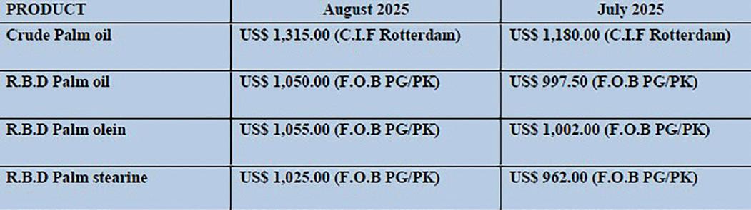 Palm oil has improved it competitiveness against other edible oils and exports have also picked up from Thailand, Indonesia and Colombia, according to Riverside Tanker Chartering Ltd’s ‘Palm Oil, Soft Oil and Molasses’ August 2025 market report.