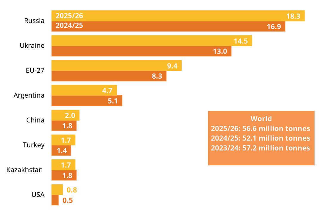 The key factor for this rise is expected larger harvests in Eastern Europe and the EU. For Russia, which remains the world’s largest producer of sunflowerseed, the IGC projects an approximate 8% rise over 2024/25, bringing the harvest to 18.3M tonnes. Ukraine’s harvest is forecast to grow even more significantly, by 11%, to reach 14.5M tonnes. For the EU-27, the IGC currently forecasts a harvest of 9.4M tonnes, which would be up approximately 14% from the previous year’s 8.3M tonnes.