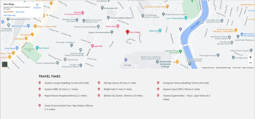 Elms BT9 includes Willow Walk and our off-site accommodation in Mount Charles, 76 Malone Road, College Gardens, Guthrie House and Grant House. Every location is situated 5-10 minutes walk from Queen's University campus.