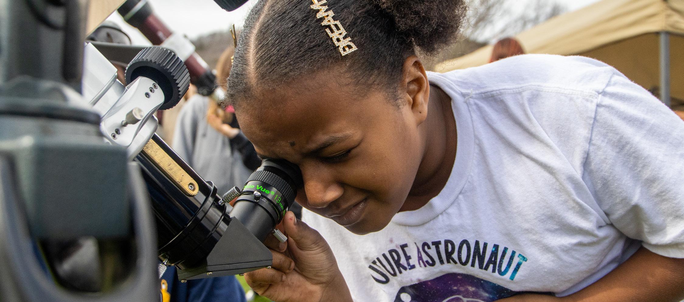 Maya Hienz, 9, from New Britain inspects the solar eclipse while donning a ‘future astronaut’ shirt.