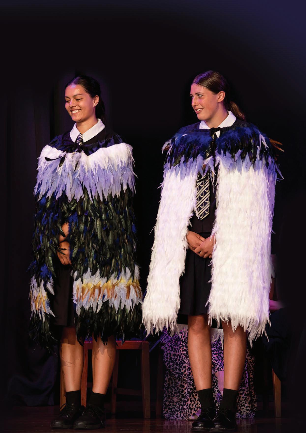 2022 Head Prefect, Lilly Taulelei (left) and 2022 Deputy Head Prefect, Pippa Nicol (right) wear the QMC korowai, a traditional Māori cloak.