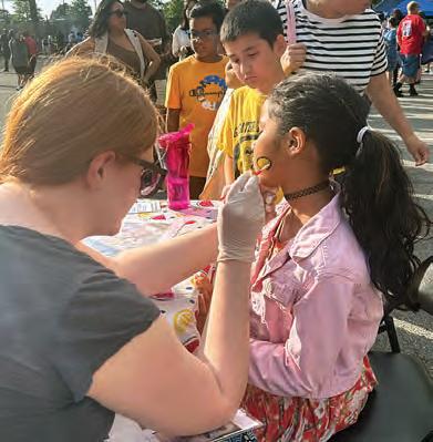At top right, Officer Nader shows off electronic detection K9 Robbie at the 106 event at Edward Byrne Park. At top left, children and families wait in line for their turn on carnival rides at the event hosted by the 102 at Victory Field. Next to them, Bella C. of Richmond Hill gets her face painted. Below her, neighbor-