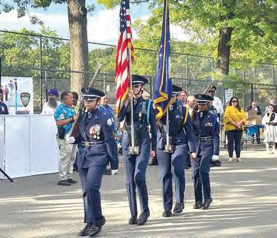 hood kids participate in a game with an officer from the 102. To their left, the color guard presents the flags at the start of the event at Victory Field.