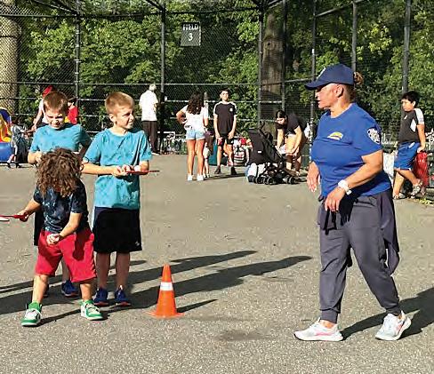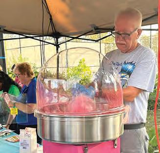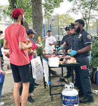 At near right, Eddie from Howard Beach serves up some cotton candy for families at the 106 gathering and below, officers from the 106 served up some barbecue fare. At far right, neighbors at the 106 event wait for their turn on a slide and officers engage in a round of catch with teens. — Kristen Guglielmo
