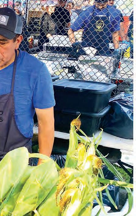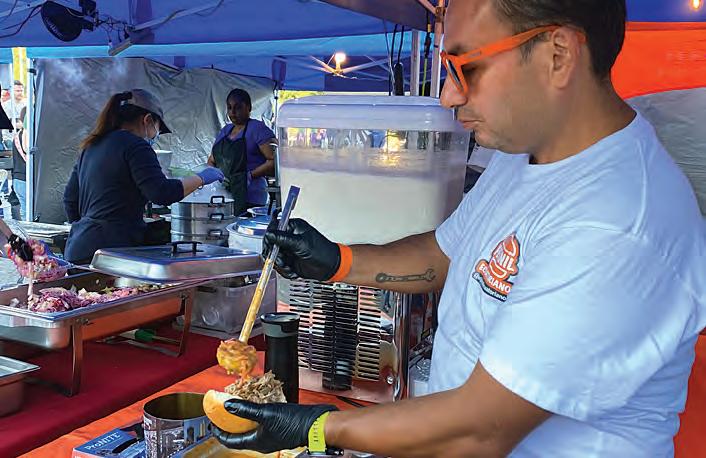 Pernil Ecuatoriano prepares its spicy Ecuadorian pork sandwich, one of the many epicurian delights at the Queens Night Market. On the cover: La Braza’s shish kababs and roasted corn tempt all comers in search of fine international cuisine . PHOTOS BY STEPHANIE