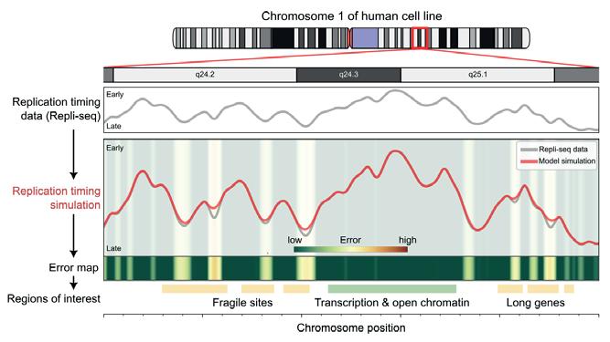Our mathematical model creates a prediction of when each position of the human genome is replicated (red curve). Comparing the model’s prediction with DNA replication timing data (grey curve) highlights points of deviation where replication proceeds more slowly than expected, indicating genomic regions that are particularly vulnerable to replication stress.