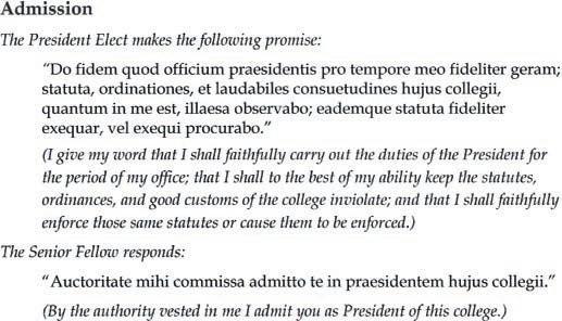 An excerpt from the Order of Ceremony of the Presidential Installation, showing the promise the President makes to the College.