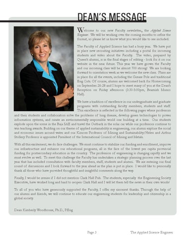 elcome to our new Faculty newsletter, the Applied Science Engineer. We will be working over the coming months to refine the format, so please let us know what you would like to see included. The Faculty of Applied Science has had a busy year. We have put in place new recruiting initiatives including a portal for incoming students and video about the Faculty. The video, prepared by Queen’s alumni, is in the final stages of editing - look for it on our website in the near future. This year we have grown the Faculty and our incoming class will be almost 700 strong! We are looking forward to orientation week as we welcome the new class. Plans are in place for all the events, including the Grease Pole and traditional Eng Cuts. Of course, alumni are welcomed back for Homecoming on September 26-28 and I hope to meet many of you at the Dean’s Reception on Friday afternoon (3:30-5:00pm, Beamish Munro Hall). We have a tradition of excellence in our undergraduate and graduate programs with outstanding faculty members, students and staff. This excellence is reflected in the following pages where professors and their students and collaborators solve the problems of lung disease, develop green technologies to power information systems, and create an environmentally responsible world one building at a time. Our students explode upon the scene in the Baja SAE and travel the Outback in the solar car while our professors continue to win teaching awards. Building on our theme of applied sustainability in engineering, our alumni explore the social and economic issues around water and our Kinross Professor of Mining and Sustainability/Helen and Arthur Stollery Professor is appointed President of the International Council of Mining and Metals. With all this excitement, we do face challenges. We must continue to stabilize our funding and enrollment, improve our infrastructure and enhance our educational programs, all in the face of the lowest per capita provincial funding for postsecondary education in the country. The profession of engineering is changing rapidly and we must evolve as well. To meet this challenge the Faculty has undertaken a strategic planning process over the last year that has included consultation with faculty members, staff, students and alumni. We are entering our final round of discussions and I look forward to the year ahead as the plan is put in place. I would like to personally thank all those who have provided thoughtful and insightful comments along the way. Finally, I would be remiss if I did not mention Clark Hall Pub. The students, especially the Engineering Society Executive, have worked long and hard to reopen Clark Hall and I will let them tell the news in their own words! To all of you who have generously supported the Faculty, I offer my sincerest thanks. Through the help of our alumni and friends, we will continue to educate our engineering students for leadership and citizenship in a global society. Dean Kimberly Woodhouse, Ph.D., P.Eng