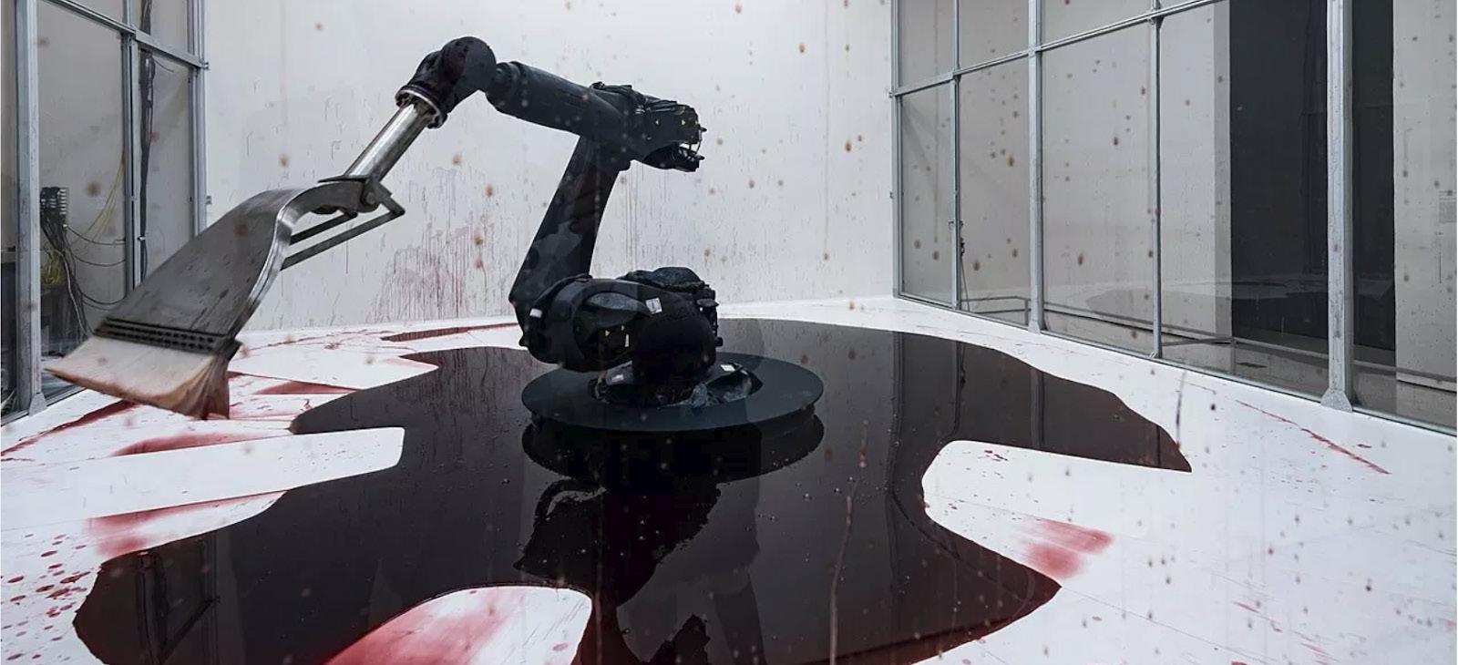 Guggenheim museum’s website, the machine is designed to have anthropomorphic, often silly, movements as it frantically sweeps the blood back into the middle of the puddle. It’s meant to comment on the seemingly endless and futile task of containing problems like migration and sovereignty. The machine goes about its ridiculous dance containing the liquid, only for streaks of blood, representing the violence that occurs in attempts to guard borders, to be left behind.