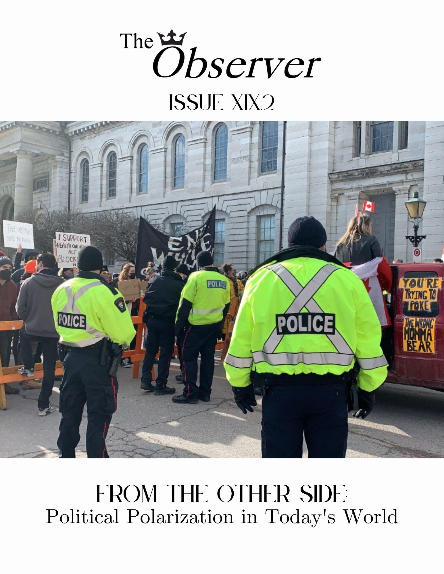 Welcometothisyear’sFallEdition,orissueXIX.2,of TheObserver, “FromtheOther Side:PoliticalPolarizationinToday’sWorld.”Wearethrilledtobringthiseditionback onlineandtoprintforreaderstoenjoy!Itbringstogetherawiderangeofissuesand ideasaboutpoliticalpolarizationintheworldtoday.