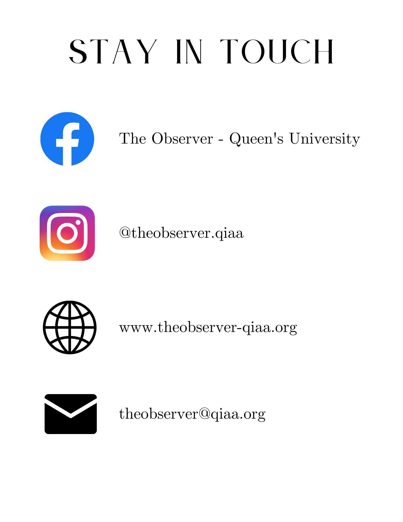 Iamproudtobringyouthesearticlesfrommyincrediblestaff,andhopethisedition invitesyoutoconsiderhowyouencounterpolarization.Iwouldliketothanktheteam fortheirhardworkinthefallterm,andI’mlookingforwardtoourfinalissuecomingin April!Ifyouhaveanycommentsorconcerns,pleasecontact TheObserver at theobserver@qiaa.org.Ifyou’dliketocontributeanarticleinthefutureorapplytojoin ourteam,followusonInstagram(@theobserver.qiaa)orFacebook(TheObserverQueen’sUniversity)forupdates.