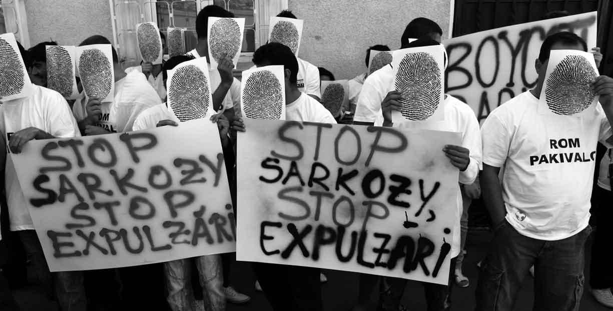 Protesting former French President Sarkozy's expulsion of Romani people.