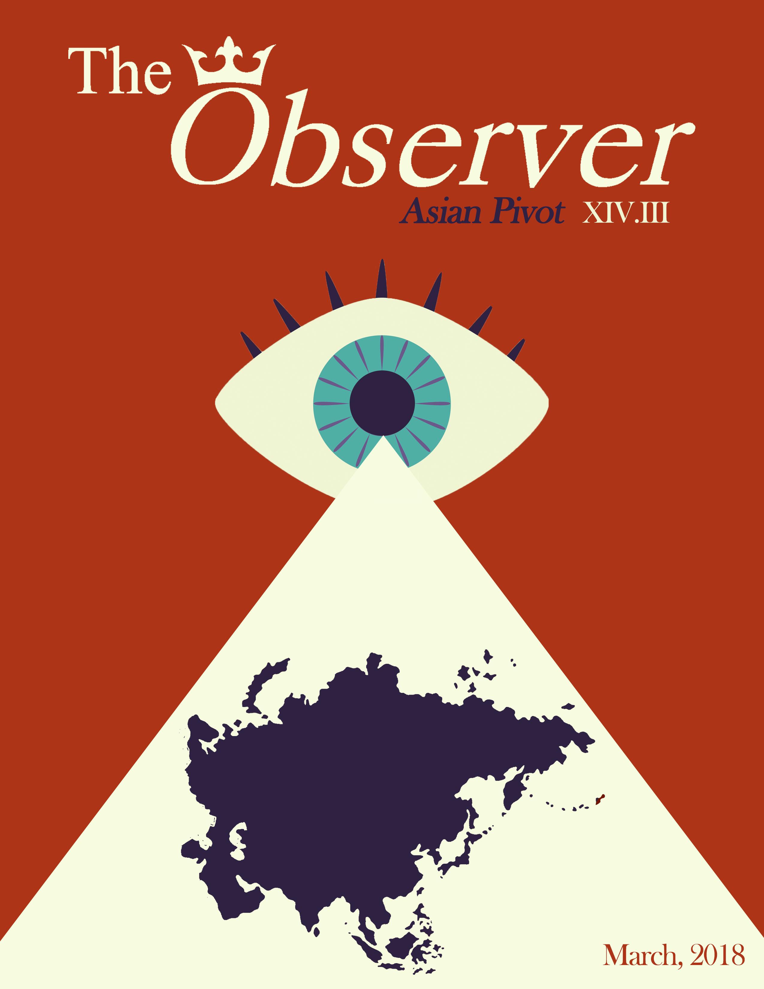 Welcome to the third issue of Volume XIV. This issue’s theme is “Asian Pivot” and offers writers the opportunity to anchor their topic in the broadly defined region of ‘Asia’. Inspired by pundits’ characterization of Barack Obama’s foreign policy, the Observer is likewise renewing its engagement with this unique region. By deepening readers knowledge of the region, this issue instills an appreciation for the cultural, political, and economic nuances of this particular square of the globe. This thematic focus allows writers to explore a variety of issues and the particularities of how they manifest within, or pertain to, the very large region of Asia. It is hoped that this issue sparks greater introspective regional analysis, as well as cross-regional comparison more broadly. Additionally, I would like to thank Charlotte Smith for her artistic talents featured on our cover, and Art Vijayaratnam for her thoughtful layout design seen between the following pages.