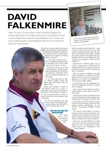 lumnist, r Mail bowls co As the Courie n bowls w no -k of the best David is one ensland writers in Que told me it was too hard to get into. I used to drop off the score books at the local paper in Tamworth and my dad was captain of the Northern District team. I started doing short stories on the games and just dropping them up to the paper and they rang me up and asked if I’d like to do a cadetship.” Falkenmire’s cricketing talent lay as much in playing as in writing and he eventually moved on to play for Sydney’s Northern Districts side while continuing to work in Tamworth.