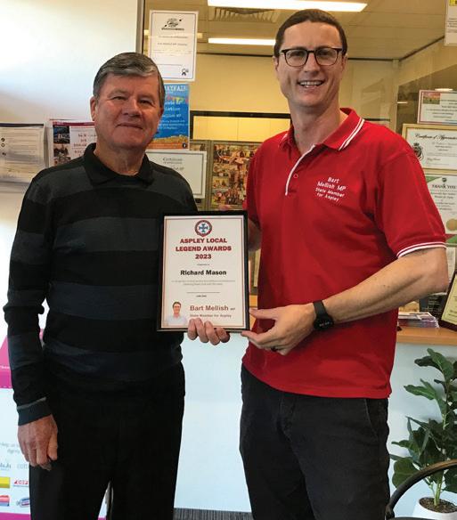 Richard Mason, outgoing chairman of Geebung Bowls Club, has been awarded the Aspley Local Legends Award 2023 for services to the club and the wider community. Presenting the award to Richard was State Member for Aspley, Bart Mellish MP.