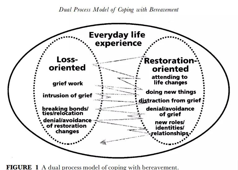 sense or the literal sense. This model is considered outdated and inaccurate. However, Margaret Stroebe & Henk Schut developed a theory in 1995 called the Dual Process Model of Coping with Bereavement that challenges the more common stages (Figure 1). This model identifies two types of stressors, loss- and restoration-oriented, and describes a dynamic, regulatory coping process of oscillation whereby the grieving individual at times confronts, at other times avoids, the different tasks of grieving.5 The model proposes that adaptive coping is composed of confrontation– avoidance of loss and