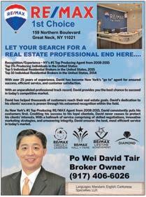Broker/Owner THINKING OF SELLING??? CALL TODAY FOR A FREE APPRAISAL DAVID TAIR Lifetime Achievement Award Winner! Direct Line: 917-406-6026 www.ptair.remax1stchoice.com 1st Choice JACKSON HEIGHTS $1,335,000 6 FAMILY This Is A Great Investment Property, Convenient Location, Close To All. Price To Sell. WHITESTONE ASKING $1,750,000 62 X 127 LOT SIZE 4 BR Center Hall Colonial W/Bridge View. Spacious Home! LR W/Fplce, Den, FDR, Kit W/Breakfast Rm And Resort-Like Patio. Landscaped Backyard Includes Above Ground Pool! Walkup Attic. GREAT NECK ASKING $335,000 1 BEDROOM CO-OP Pre-War Building. Lowest Maintenance In Town. High Ceilings, Renovated Kit & Nice Hardwood Floors. Large LR/DR, BR & Bath. Move Right In! Close To LIRR. Cats Allowed. BAYSIDE ASKING $325,000 UPPER CORNER 2 BR Co-op Apartment In Good Location Near Parks, Shops, School, Restaurants. Security, Pet Friendly. No Flip Tax, Maintenance Includes All Except Electricity. Attic For Storage. Lots Of Closets. Sublet Is Allowed After 2 Years. FOREST HILLS GARDEN • ASKING $2,890,000 • LOCATION!! LOCATION!!