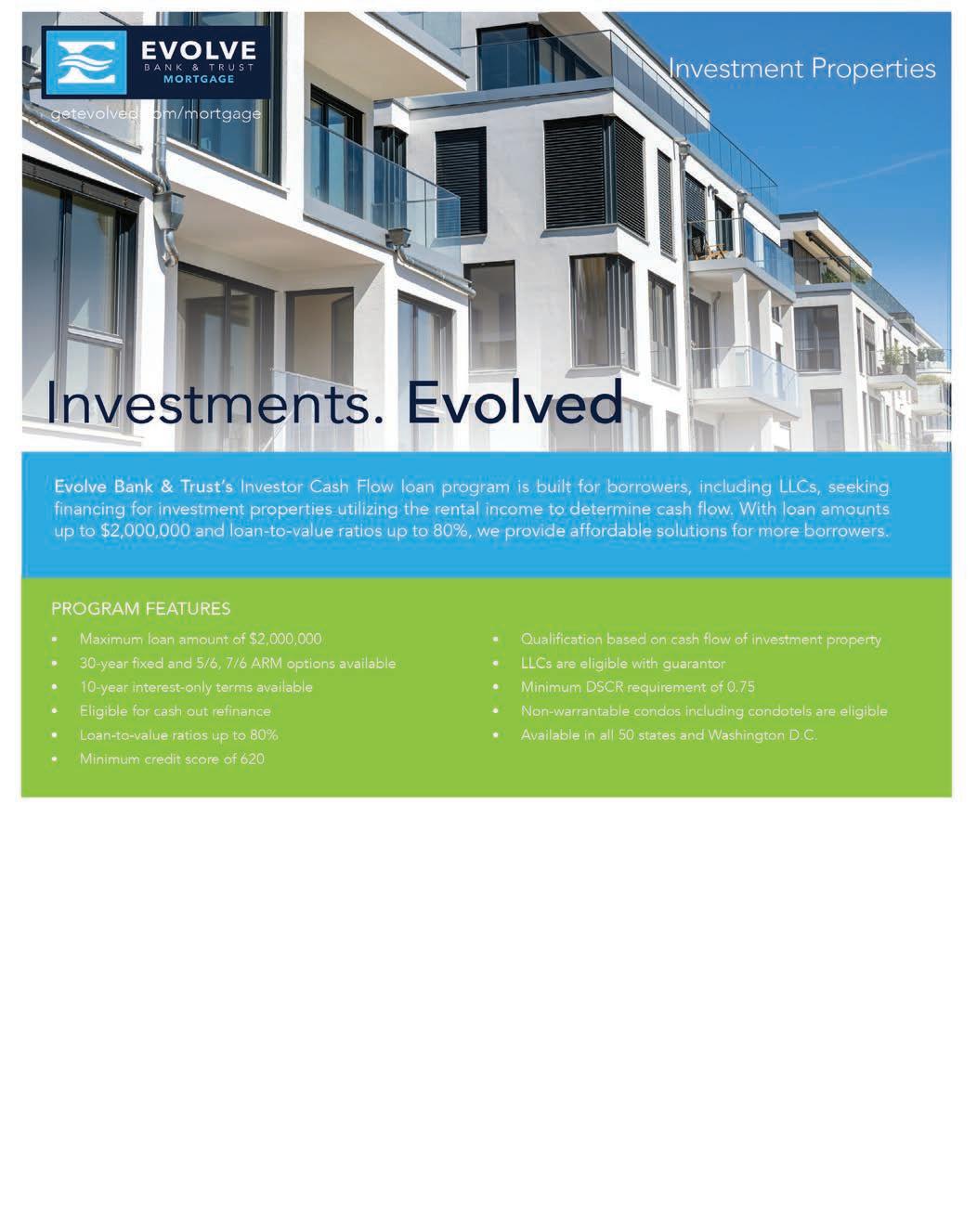 Evolve Bank & Trust’s Investor Cash Flow loan Program is built for borrowers, including LLC’s, seeking financing for investment properties utilizing the rental income to determine cash flow. With loan amounts up to $2,000,000 and loan-to-value ratios up to 80%, we provide affordable solutions for more borrowers.