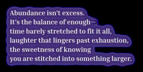 Abundance isn’t excess. It’s the balance of enough time barely stretched to fit it all, laughter that lingers past exhaustion, the sweetness of knowing you are stitched into something larger.
