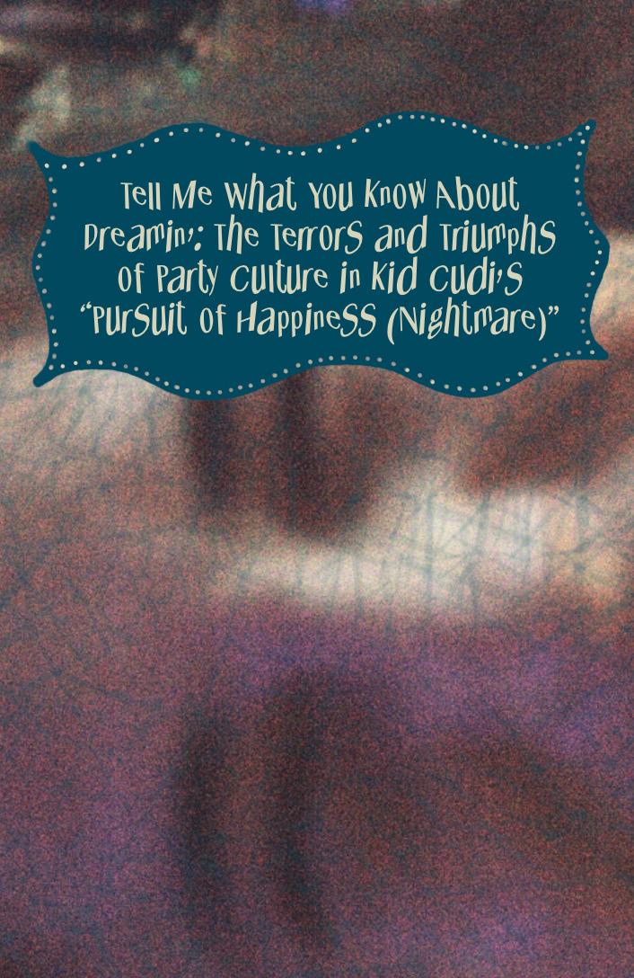 “(Nightmare)” being in the title’s brackets implies how the consequences of party culture, and utilizing drugs as a means of attaining contentment, is often neglected in dominant pop culture narratives. Cudi’s consideration that night10 mares are often the aftermath of partying can be analyzed with Katherine McKittrick and Alexander G. Weheliye’s sentiment that “the practice of loving, desperately, the unspeakability of music, is found, in part, in our neurobiological and physiological and intellectual response to that music and music makers” (20). As the chorus does not address the “nightmare[s]” in the song’s title, Cudi conveys the “unspeakability” of heartache, mental illness and night terrors in an environment that attempts to numb these difficulties through various substances, while desiring to be loved and heard amidst the noise.