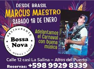 Pizza Sing Karaoke busca a “La Reina” del karaoke 21 h. Reservas T. 094 415 620 Homenaje a Sandro, “Culto Gitano”, 21 h en Enjoy. Entradas en suticket.com ver nota pág. 14 Concierto de la Orquesta Departamental, 21 h en Plaza Artigas de Punta del Este. Gratuito. Bossa Nova Restaurant, Noche de Brasil con Marcus Maestro. Calle Virazón y La Salina. T. 099 298 339