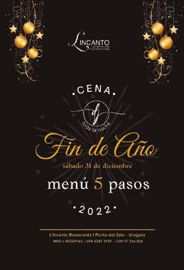 SANTA LEONCIA – Tentempié y Recepción – Pincho wagyu, Alcaucil grillado envuelto en jamón crudo y cherry confitado. Entrada: Pulpo a las brasas sobre crocante de papas, Tartar de Salmón y palta, Envoltini de verduras en philo con baba ganoush. Principal: Primer paso: Pasta rellena de sirí con salsa de mariscos. Pasta rellena de espinaca y queso con salsa de cherrys y variedad de hongos (gluten free). Segundo paso: Bife ancho madurado con salsa de tannat acompañado de milhojas de papas. Atún rojo marinado en salsa de thai acompañado de cous cous asiático. Postre: Creme brulee, Marquisse de chocolate con frutos rojos. Show en vivo y Dj. Precio USD 220 hasta el 29/12, menores de 12 años USD 110, de 0 a 4 años sin costo. Reservas Cel. 091 754 366.