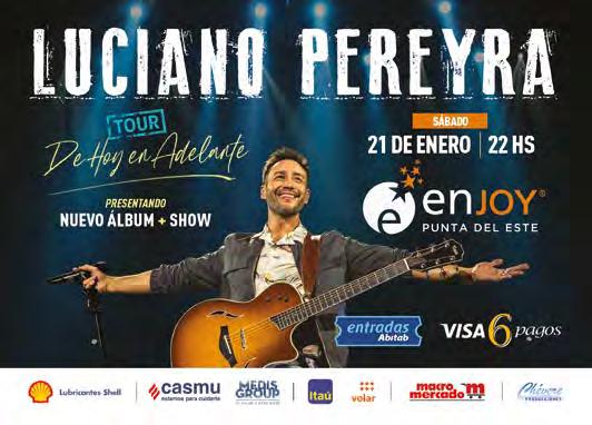 exitosa trayectoria, editó 14 álbumes, vendió más de 1 millón de discos, acumula millones de reproducciones en plataformas digitales y ha batido año tras año los récords de asistencia de público a sus conciertos. Luciano ha desarrollado un estilo único que fusiona elementos del folclore sudamericano con ritmos pop y urbanos. Con toda su banda y sus grandes éxitos transformará la noche del sábado 21 en Enjoy Punta del Este en una gran fiesta en otra realización de Chévere Producciones. Entradas en Abitab, con VISA hasta 6 pagos sin recargo.