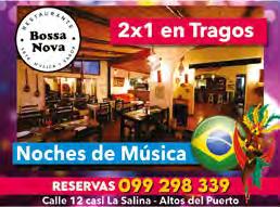 La Mia Cucina, música en vivo La voz de la Tribu tocando clásicos de todos los tiempos. 21.30 h Noche de Brasil con música en vivo y performance de bailarines en Restaurante Bossa Nova. Calle 12 casi La Salina. T. 099 298 339