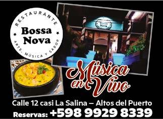 Bossa Nova Restaurant, música en vivo. Carlos Tejera y Tomás Vera. Calle Virazón y La Salina. 099 298 339 “Aquí me quedo” una comedia cotidiana para reír sin parar. Patricia Alvarez y Sebastián Slepovich, 21.30 en Teatro Fernandino. T. 099 389 237