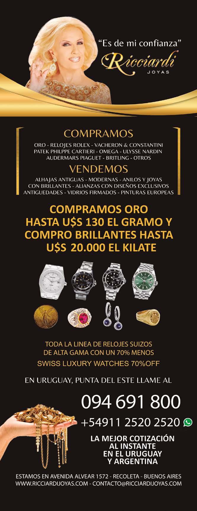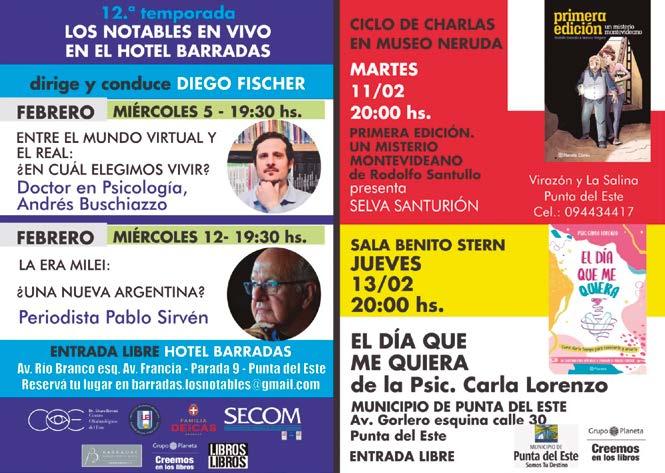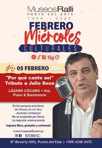 Semana del Mar 19 h El Mar y la salud ¿Es bueno consumir agua de mar? Charla de Alvaro Arriola y Dr. Eduardo Nicora. Entrada libre en Municipio de PDE Charla, “Entre el mundo virtual y el real: ¿En cuál elegimos vivir?”. 19.30 h. en Hotel Barradas, Grupo Planeta. Ver nota en pág. 4 Museo Ralli, 20 h “Por qué canto así” Tributo a Julio Sosa. Lázaro Cócaro + Voz, Piano & Bandoneón. En los parques exteriores del Museo al aire libre. Gratuito. Bº Beverly Hills.