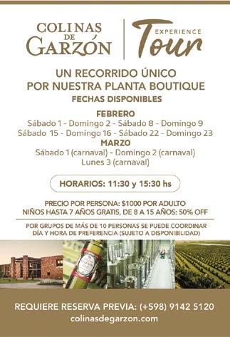 Recorrida guiada a orillas del Humedal del Arroyo Maldonado, 8 am, observación de aves dentro de este ecosistema, cupos limitados 20 personas. Duración 2 h, gratuito. Desde “Muelle El Placer” junto al puente ondulado de La Barra. Informes T. 099 984 848 coapuntadeleste@avesuruguay.org.uy Travesía Internacional de la Laguna del Sauce, 9 h nado en playa de Club del Lago. Punta Ballena. @travesiasuruguay Colinas de Garzón Experience Tour, recorrido único por la planta boutique 11.30 y 15.30 h con reserva previa. $ 1.000, de 8 a 15 años 50 % off y niños hasta 7
