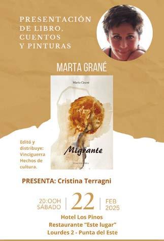 Santa Panda Music Festival 19.45 Tierra de Tango. SantaPanda.org ver nota en pág. 11 Presentación de libro, cuentos y pintura de Marta Grané “Migrante”. Editó y distribuye Vinciguerra Hechos de Cultura. Presenta Cristina Terragni. 20 h Hotel Los Pinos. Restaurante “Este Lugar” calle Lourdes y Dr. Mario Scasso. Punta del Este. T. 099 719 009 Azotea de Haedo 20 h “Torres García, padre del constructivismo” Espectáculo de humor. Elenco Fundación Banco República. Gratuito. La Azotea y Del Museo. T. 4223 1786