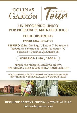 Colinas de Garzón Tour Experience, un recorrido único por su planta boutique, horarios 11.30 y 15.30 h. Requiere reserva previa al +598 9142 5120. Adultos $ 1.200, de 8 a 15 años 50% off, niños hasta 7 años gratis. Colinasdegarzon.com.