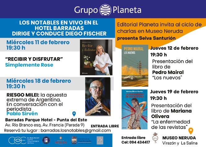 Grupo Planeta en Museo Neruda, Pedro Mairal presenta el libro “Los Nuevos” conduce Selva Santurión. 19.30 h Gratuito. Presentación del libro “Invasiones” de Margara Ferber. 19.30 h en Municipio de Punta del Este. Gratuito. T. 099 195 793