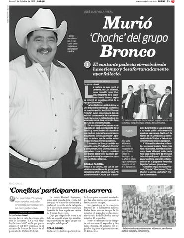 a mañana de ayer murió el cantante José Luis Villarreal, mejor conocido como ‘Choche’, integrante de la legendaria banda Bronco, según se informó en la página oficial de la agrupacióin norteña. “La familia Bronco está de luto y se une a la pena que embarga a la familia de nuestro querido José Luis Villarreal ‘Choche’, quien esta mañana dejó de existir a consecuencia de su enfermedad, misma que lo había alejado de los escenarios desde hace poco más de un año”, se lee en el comunicado. “En este tiempo Chocheman se recuperaba en casa, acompañado de su familia y sometiéndose al cuidado de sus médicos, quienes le recomendaron tratamiento con células madre”, agregan, sin aclarar que la terrible enfermedad era nada menos que cirrosis. El baterista de Bronco también era conocido como ‘PonyChoche’, ‘Choche’ y ‘Chocheman’, éste último porque su compañero Lupe Esparza consideró que Bronco debía tener su propio personaje de acción y le compuso un tema con ese título a Villarreal.