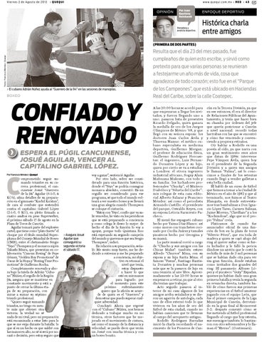 omprometido seguir sumando triunfos en su carrera profesional, el cancunense Josué “Guerrero de la 94” Aguilar (6-1-0, 4 KO’s), afina detalles de su preparación en el gimnasio “Kuchil Ka’atun”, de cara al combate que sostendrá contra el capitalino Gabriel López (2-1-0, 0 KO), en pleito firmado a cuatro asaltos en peso Superwelter, el próximo sábado 17 de agosto en la Plaza de Toros de Cancún. Aguilar tomará parte del explosivo cartel, que tiene como “plato fuerte” el choque por el título mundial Superpluma del Consejo Mundial de Boxeo (CMB), entre el chetumaleño Sergio “Yeyo” Thompson y el monarca nipón Takashi Miura, que presentan en colaboración “Cancun Boxing” de Pepe Gómez, “Golden Boy Promotions” de Óscar de la Hoya y “Boxing Time Promotions” de Guillermo Rocha. Completamente renovado y ahora bajo la tutela de Adrián “Cubano” Núñez, el orgullo de la Región 94, asegura que se mantiene en constante movimiento y está a punto de cerrar la última etapa de su preparación, con miras a sumar su séptimo triunfo profesional. “Quiero seguir sumando triunfos, no tengo en mente más que obtener otra victoria; la verdad no sé nada de mi rival, pero mi preparación está encaminada a estar listo para lo que se me exija durante la batalla; lo que sí es un hecho es que saldré con las manos en alto, no sé si será por nocaut o decisión, pero estoy seguro que