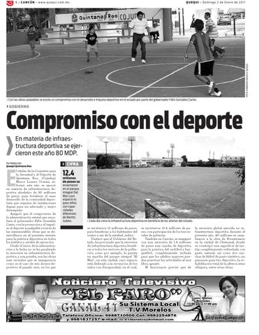 l titular de la Comisión para la Juventud y el Deporte de Quintana Roo, (Cojudeq) Marco Lozano Ocman, informó este año se ejerció en materia de infraestructura deportiva alrededor de 80 millones de pesos, para fortalecer el sano desarrollo de la comunidad deportista que requiere de instalaciones dignas para un adecuado y mejor desempeño. Aseguró que el compromiso de la administración estatal que encabeza el gobernador Félix González Canto, con la promoción y el impulso al deporte es palpable a través de las innumerables obras que se desarrollaron en el presente sexenio para la práctica deportiva en todos los ámbitos y niveles de ejecución. Desde el inicio de la administración a la fecha no se ha paralizado la inversión en infraestructura deportiva, y una prueba, son las obras más recientes que se inauguraron como es el caso de seis domos deportivos el pasado mes, en los que