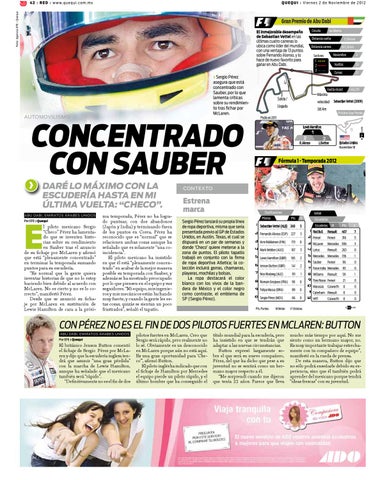 l piloto mexicano Sergio “Checo” Pérez ha lamentado que se inventen historias sobre su rendimiento en Sauber tras el anuncio de su fichaje por McLaren y afirmó que está “plenamente concentrado” en terminar la temporada sumando puntos para su escudería. “Es normal que la gente quiera inventar historias de que no lo estoy haciendo bien debido al acuerdo con McLaren. No es cierto y no es lo correcto”, manifestó Pérez. Desde que se anunció su fichaje por McLaren en sustitución de Lewis Hamilton de cara a la próxi-