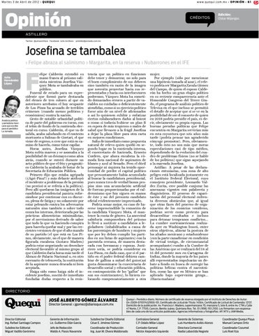 tencia que un político en funciones debe tener y demostrar, no solo para el buen cumplimiento de sus deberes sino también en razón de la imagen que necesita proyectar hacia sus representados y hacia sus interlocutores poderosos. Vázquez Mota ha cometido demasiados errores a partir de variables no cuidadas o deficientemente atendidas, como si su ejercicio político fuese aún de un nivel de aficionados o así lo quisiesen exhibir y enfatizar ciertos colaboradores dados al boicot o como si todavía hubiese un plan B en espera de más tropiezos o males de salud que llevasen a la frágil Josefina a dejar la plaza libre para otra carta en mejores condiciones. Salta de inmediato como propuesta natural de relevo quien quedó en segundo lugar en la contienda interna, el exsecretario de hacienda, Ernesto Cordero, que ahora encabeza la cómoda lista nacional de aspirantes de blanco y azul al Senado. Pero el dócil personaje ni siquiera ha tenido oportunidad de perder el capital político que presuntamente había acumulado al buscar la candidatura presidencial, pues nunca tuvo de verdad bonos propios sino una acumulación artificial de fuerzas proporcionadas por el calderonismo que hoy siguen en manos de éste y no del presunto candidato oficial evidentemente improvisado. Podría sonar mejor, en caso de hacerse imprescindible la remoción de la candidata Vázquez Mota, el mantener la cuota de género. La ancestral sabiduría componedora del priismo le llevó a sustituir a candidatos a legisladores (inhabilitados a causa de los porcentajes de hombres y mujeres que por ley deben cumplir los partidos en sus listas de aspirantes) con la parentela cercana, de manera destacada con hermanas y esposas. Justiciero sería, se podría considerar en Los Pinos, en dado caso, que si el partido en el poder federal debiera cambiar de gallina a mitad del guiso(así gusta denominarse la exsecretaria de desarrollo social y educación pública, en contraposición de los “gallos” que son sus contrincantes), lo hiciera colocando compensatoriamente a otra