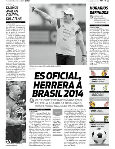 objetivos, además de que no fijó aún una meta o requisito que se ponga al Tri en el Mundial de Brasil 2014. “Están invitados en enero para revisar la planeación y los objetivos de las selecciones nacionales para el 2014”, agregó. “Nunca nos ha dado miedo ponernos objetivos altos, pero hay que platicarlo con Miguel Herrera”. Dijo que habrá, además del partido del 29 de enero, cinco partidos antes de la Copa del Mundo, así como unas concentraciones entre semana para el equipo. “La concentración está planeada para el 12 de mayo y se irían incorporando conforme sus equipos queden fuera de la liguilla”. “Los de Europa vendrán hasta que acaben sus ligas”. Hay que ver el sorteo, saber quién nos toca para empezar a buscar rivales. La despedida podría ser ante Polonia en el “Azteca”.
